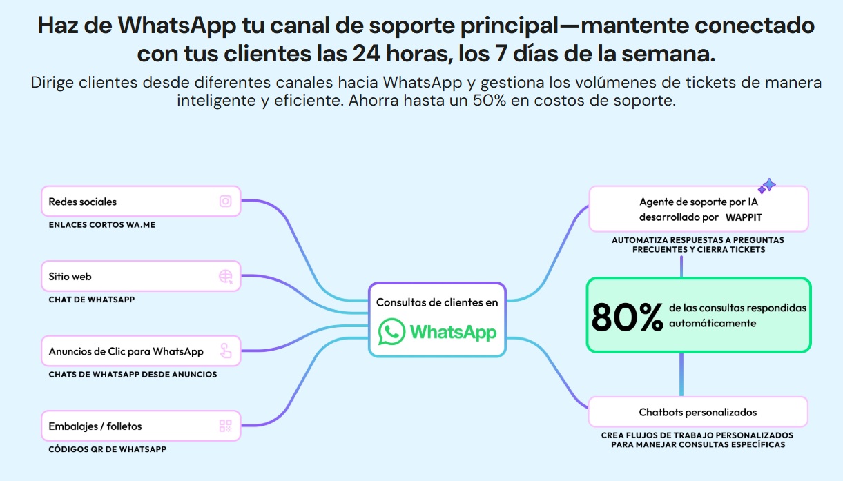 Integra la atención automática de canales de chat y redes sociales, tales como: WhatsApp, Facebook, Instagram, Telegram y chat web, a través de una única aplicación con capacidad para atender hasta 180 conversaciones simultáneas por minuto, reduciendo así los costes fijos de nómina de empleados y sin necesidad de contar con un departamento de desarrollo de software.